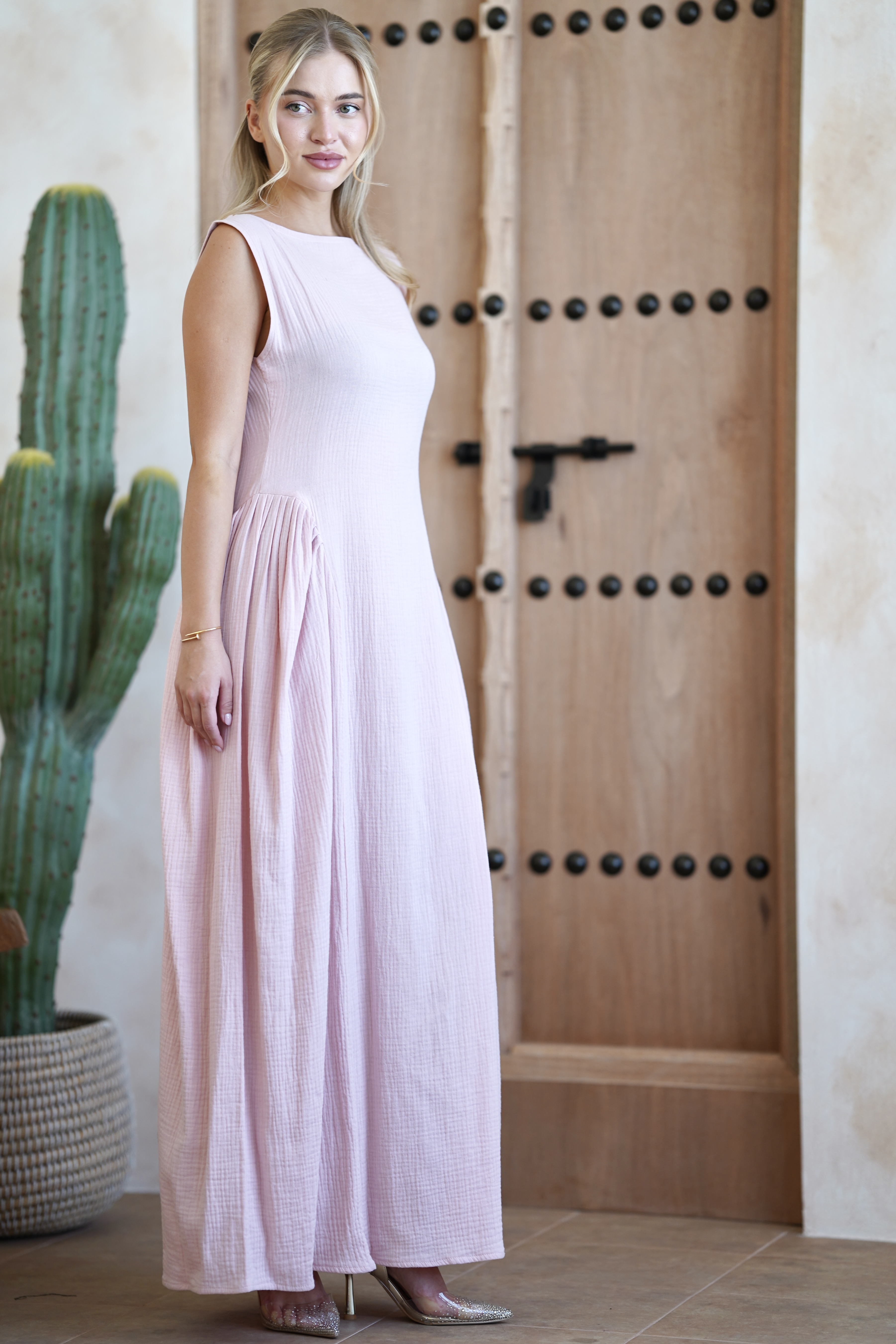 فستان طويل بتصميم انسيابي يجمع بين الأناقة والبساطة. مصنوع من قماش قطني خفيف يمنحك راحة طوال اليوم مع ملمس ناعم على البشرة. يتميّز بقصّة خصر مرتفع تنسدل منها الطيات بانسيابية لخلق حركة أنثوية راقية. مثالي للإطلالات اليومية أو المناسبات البسيطة، ويمنح إحساسًا طبيعيًا بالفخامة الهادئة.