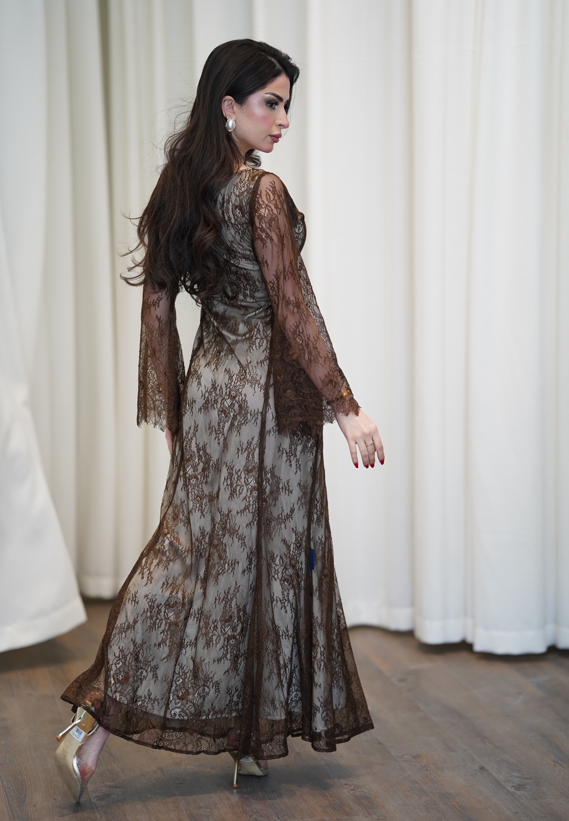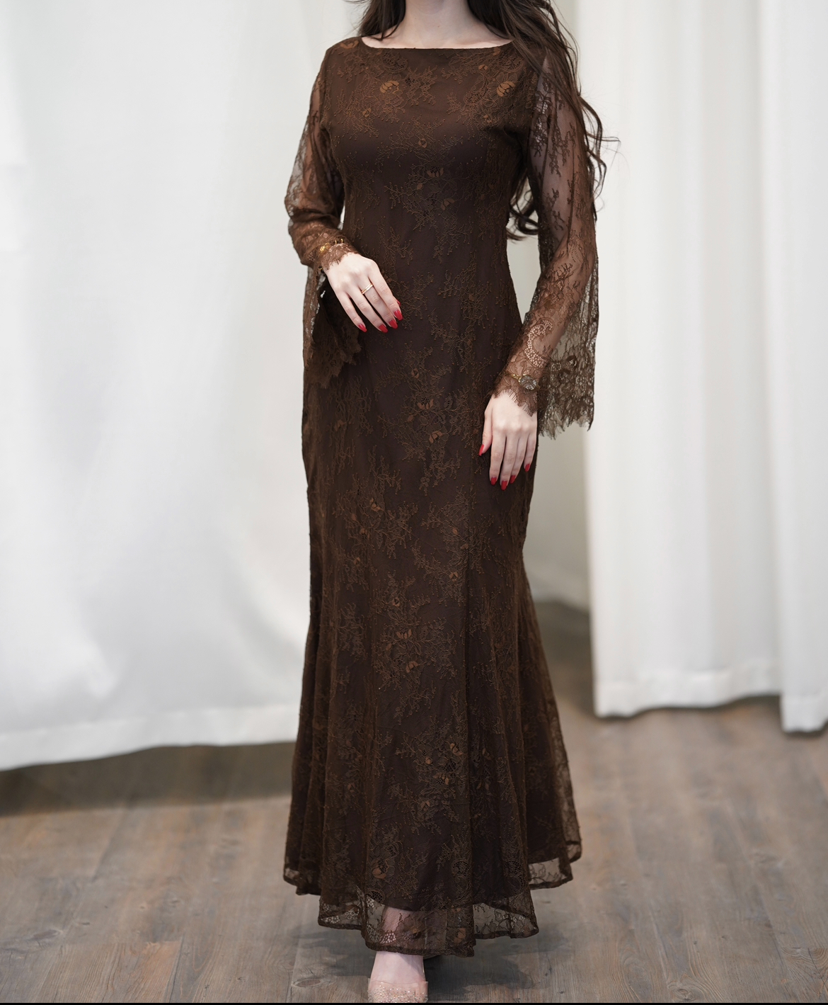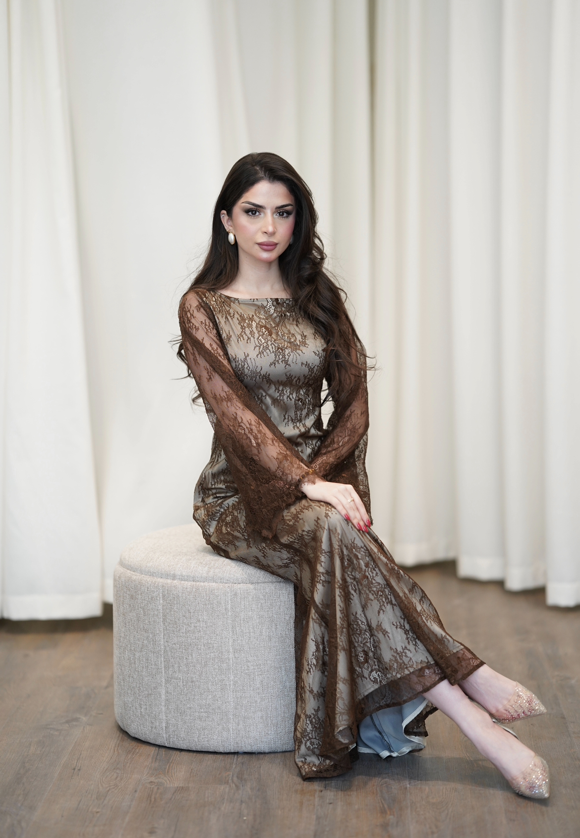 فستان أنثوي للمناسبات او تحت عباية المناسبات ، الفستان الي لابسته العارضة دانتيل بني غامق ، دانتيل بني غامق بطانه لؤلؤي ، إذا بغيتي اي أضافه اكتبي في الملاحظات.