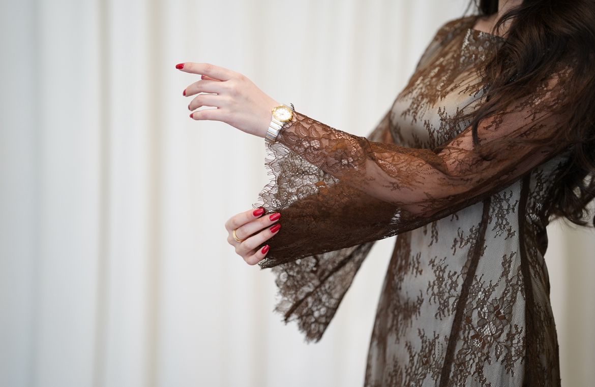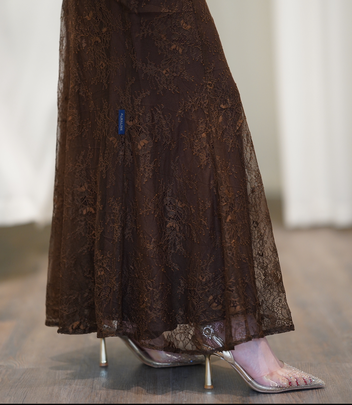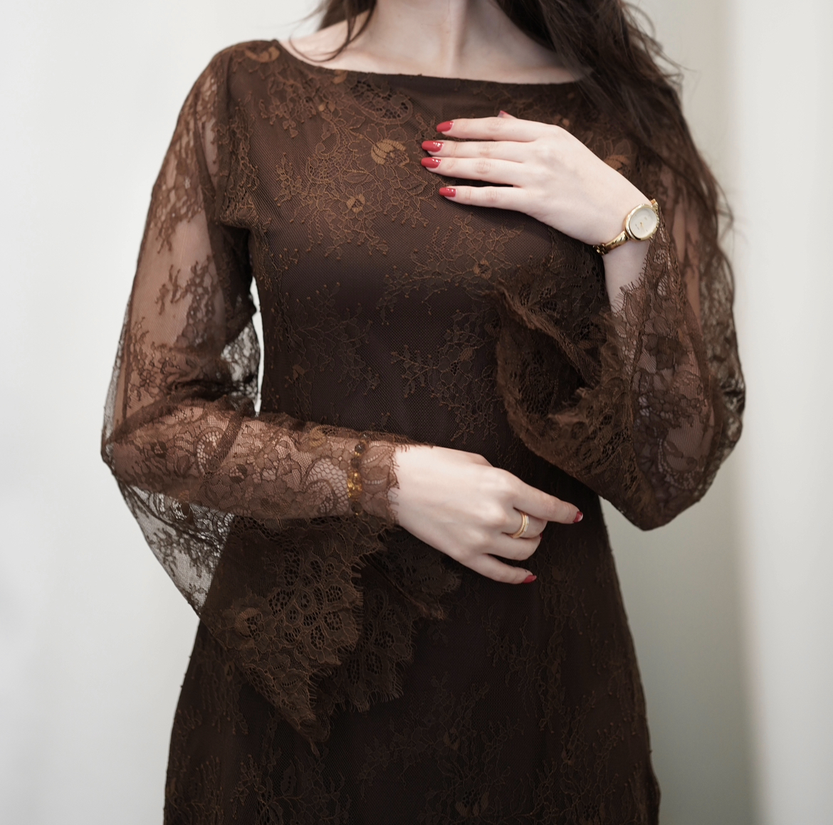 فستان أنثوي للمناسبات او تحت عباية المناسبات ، الفستان الي لابسته العارضة دانتيل بني غامق ، دانتيل بني غامق بطانه لؤلؤي ، إذا بغيتي اي أضافه اكتبي في الملاحظات.